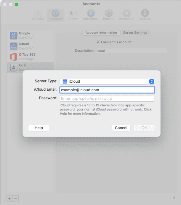 BusyContacts là một ứng dụng khách hàng đồng bộ với máy chủ. Thông thường, ứng dụng Danh bạ tích hợp trên macOS và iOS được cấu hình để đồng bộ hóa với iCloud, Google hoặc Exchange, tất cả đều tương thích với BusyContacts