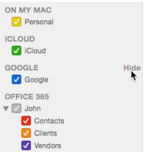 Bạn có thể mở rộng hoặc thu gọn tài khoản trong danh sách nguồn bằng cách di chuột qua bên phải tên tài khoản và nhấp vào liên kết Hiển thị hoặc ẩn